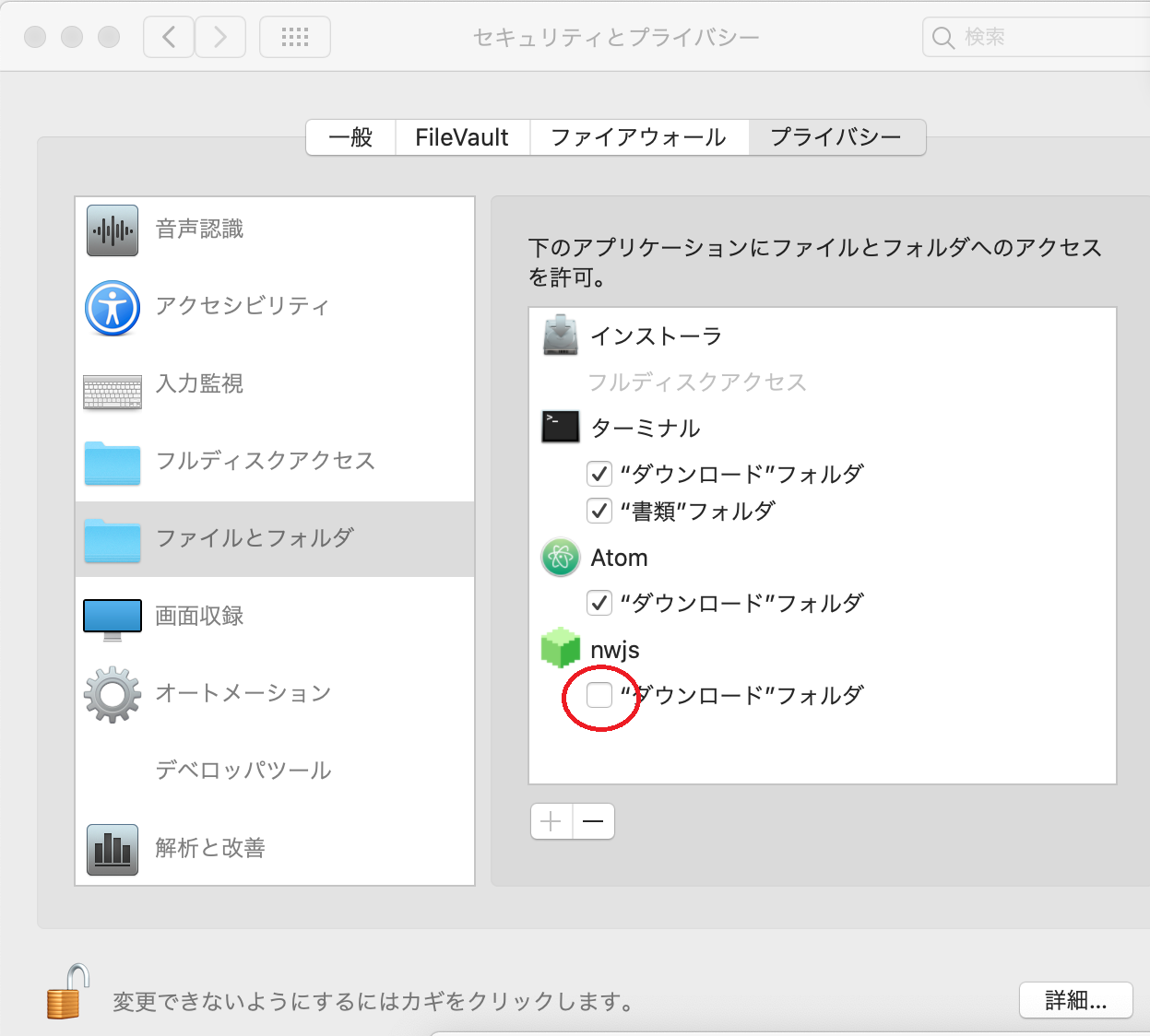 「ダウンロード」「ドキュメント」などのフォルダにインストールして実行したとき, 「"nwjs"からフォルダ内のファイルにアクセスしようとしています」と表示される場合, 「OK」を選んでください.「許可しない」を選んでしまった場合,次のようなメッセージが出て起動できなくなります.